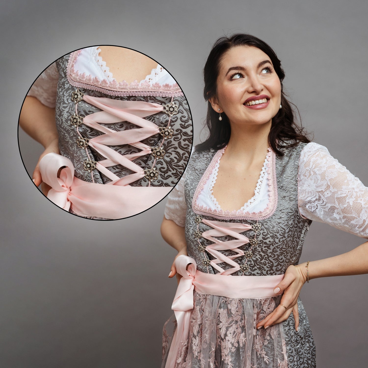 Die Verzierungen des Dirndlmieders sind mit Liebe designt und verleihen dem Look einen traditionellen Charme. Die qualitativen Materialen und Handarbeit machen das Dirndl einzigartig.