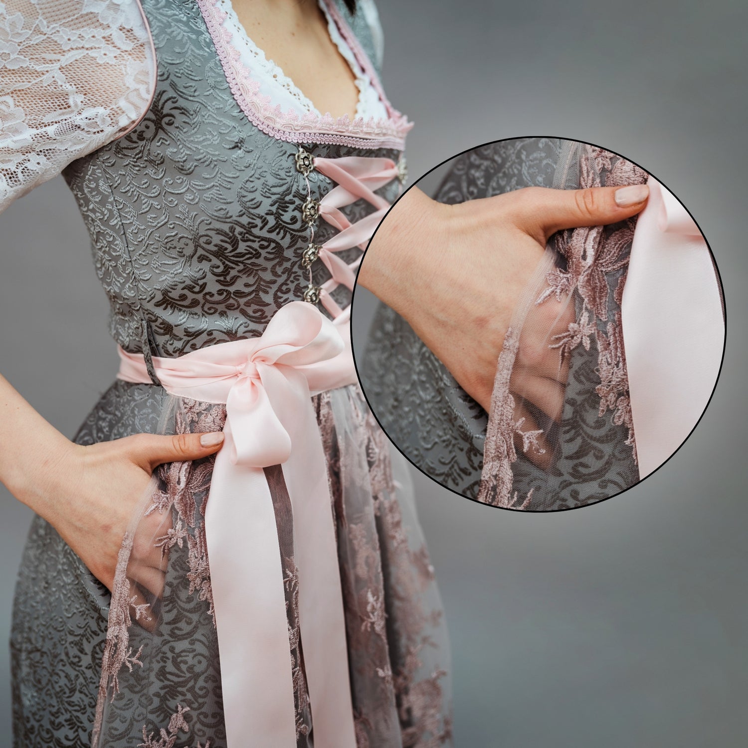 Die integrierte Dirndltasche bietet praktischen Verstauraum für Kleinigkeiten und ist unauffällig verarbeitet.