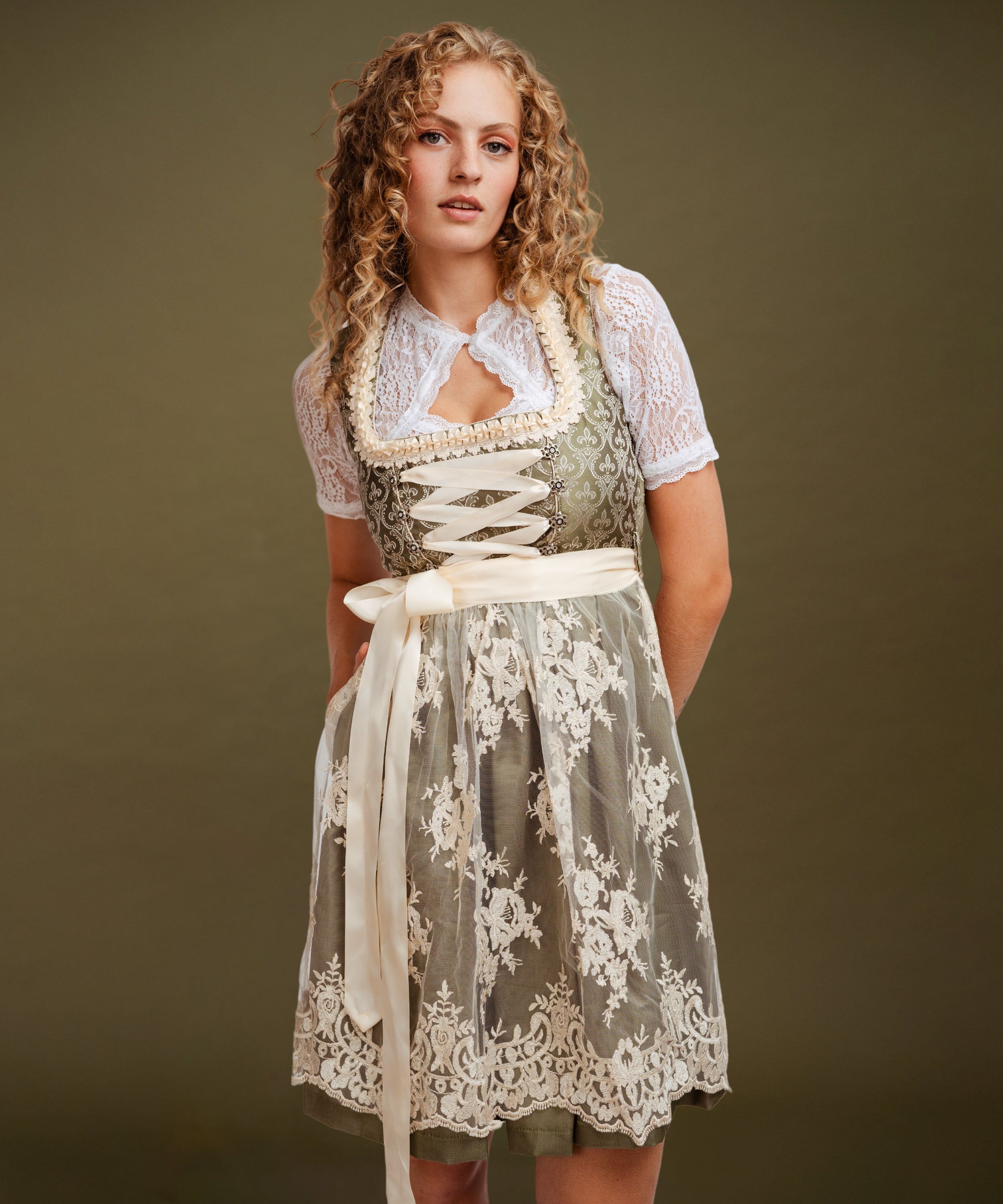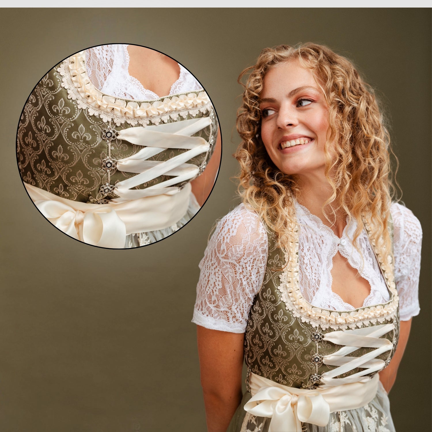 Die Verzierungen des Dirndlmieders sind mit Liebe designt und verleihen dem Look einen traditionellen Charme. Die qualitativen Materialen und Handarbeit machen das Dirndl einzigartig.