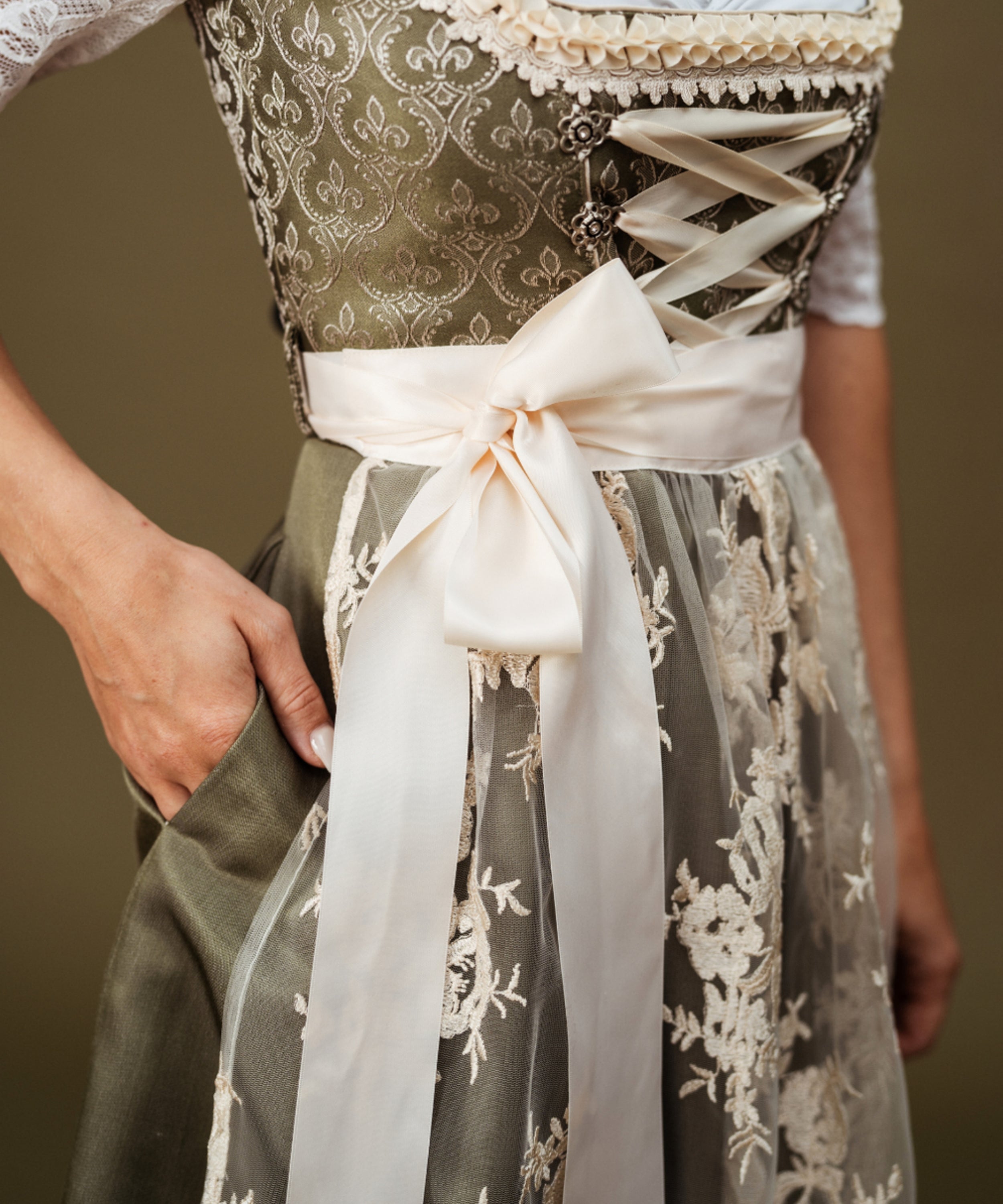 Die integrierte Dirndltasche bietet praktischen Verstauraum für Kleinigkeiten und ist unauffällig verarbeitet.