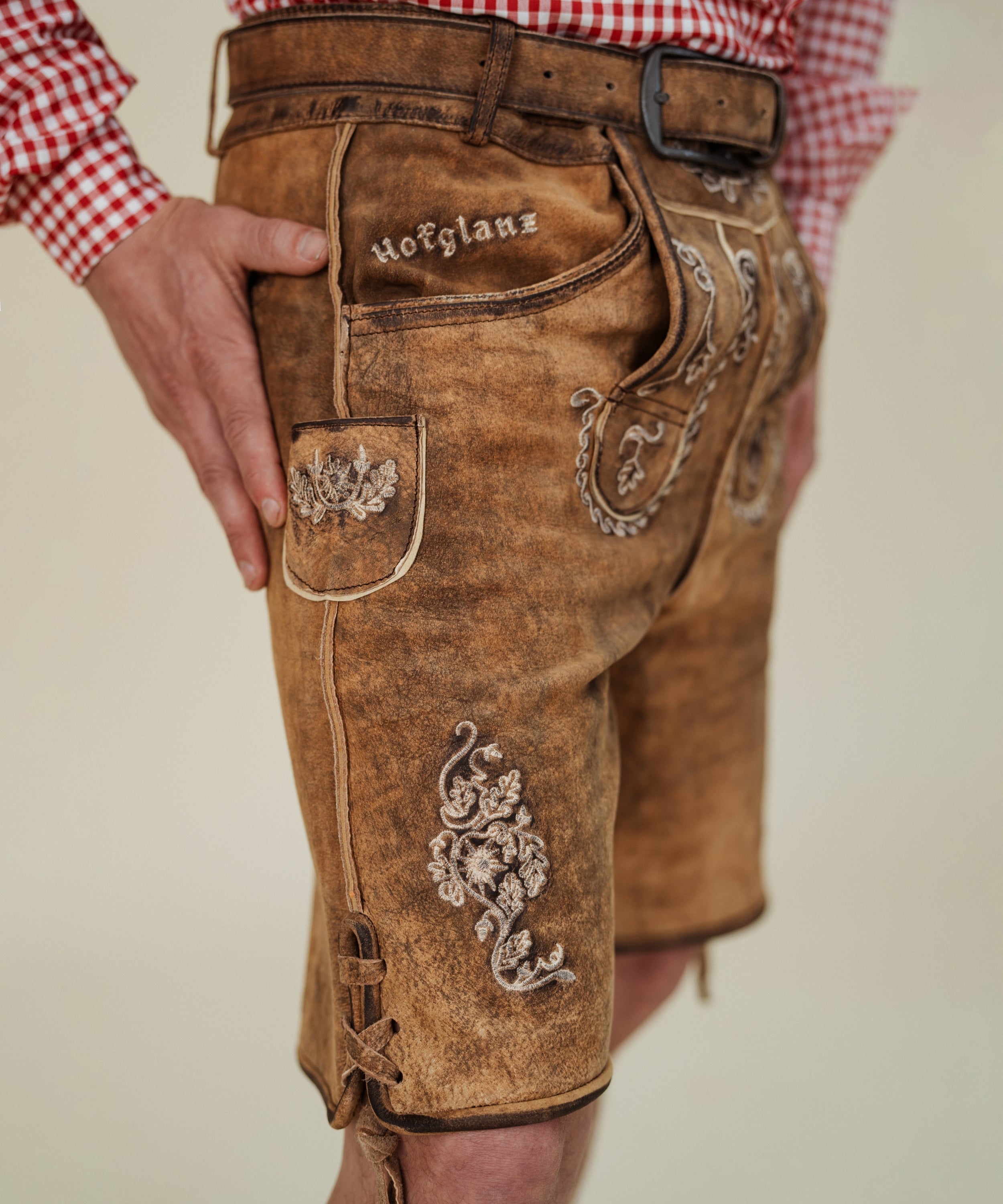 Die Hose wird aus erstklassigem Nubukleder hergestellt. Dank kräfitger Nähte ist die Lederhose robust und langlebig. Der Antik-Look und die Verzierungen geben der Hose einen traditionellen Charme.