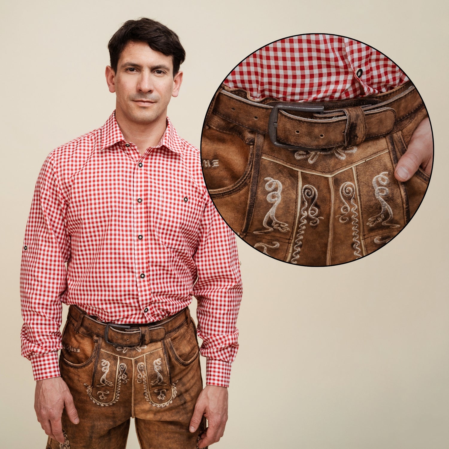 Die Lederhose wird mit passendem Ledergürtel geliefert. Dieser ist traditioneller Bestandteil der Lederhose im Antik-Look.